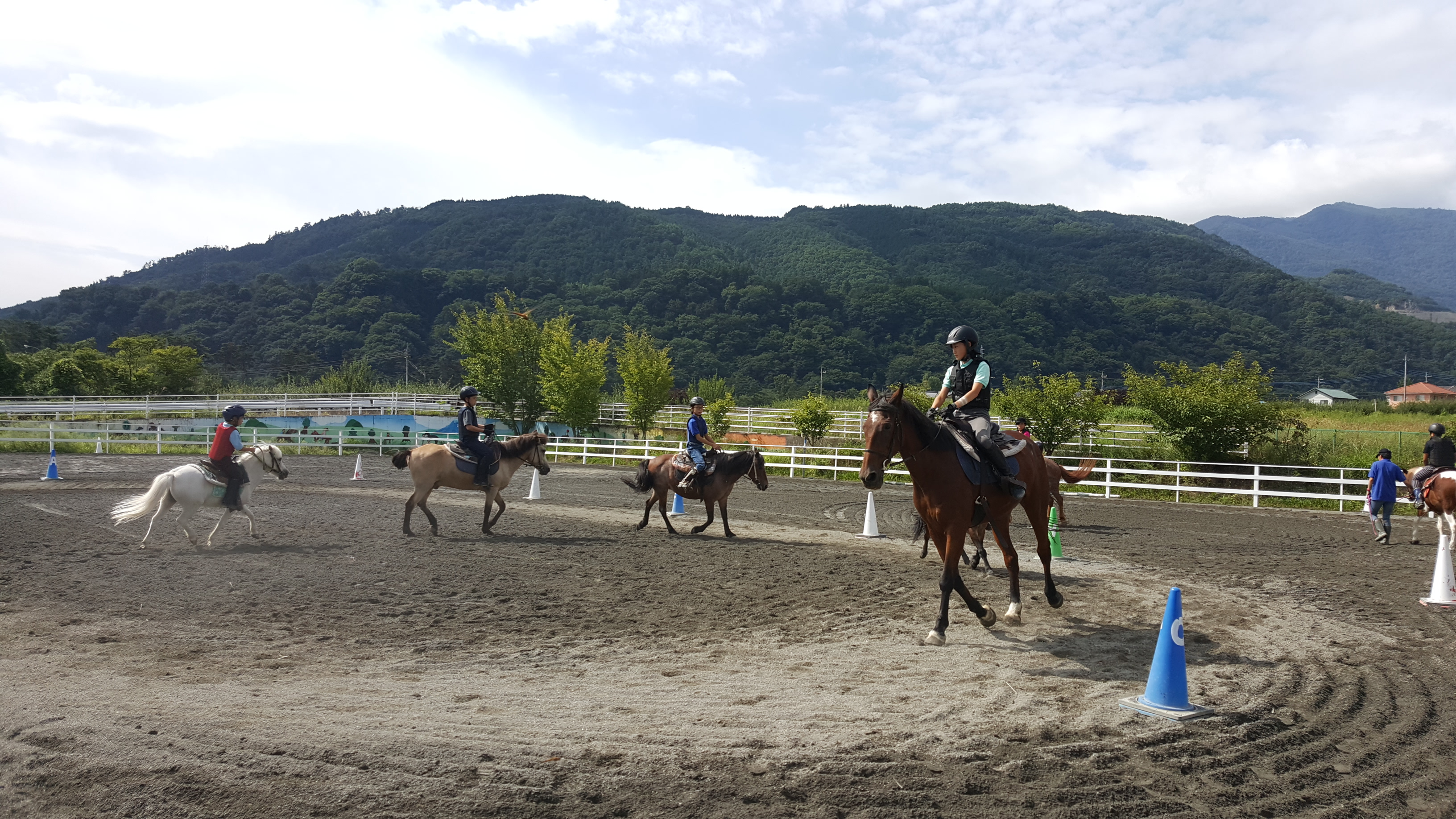 8月の外乗 馬道も暑かった日 日々の出来事 2017年08月07日 南アルプス市乗馬センターでは、御勅使川(みだいがわ)沿いに馬道があり、ご希望のお客様には、外乗りもご提供しております(^○^)外国に住んでいた時には、乗馬レッスンを受けていたこともあるそうです(^O^) 久しぶりの乗馬ということなので、ポニーくらぶのメンバーに先導してもらい、馬道を走り抜けます(^○^)芦毛のエルスケくんも先導馬で活躍! 道草タイム\(^o^)/! 木曽馬のこうちゃんも嬉しそうに走っていました♪そして、お手伝いのポニーくらぶメンバーもよく、走りましたぁ~!この日は、珍しく、馬道も暑かったのですが、お話をしながら、楽しかったですね(^ー^)