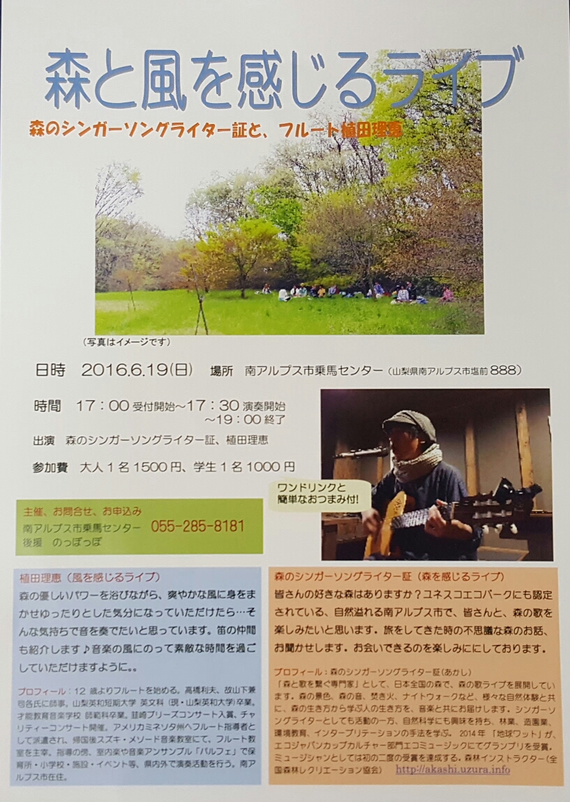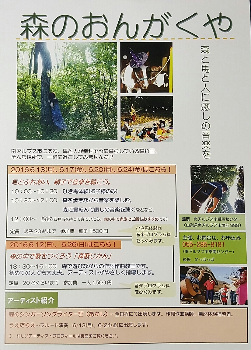 森のおんがくや♪ お知らせ 2016年06月06日 南アルプス市乗馬センターでは、6月を音楽月間として、さまざまな企画を開催致します(^ー^)森のおんがくや ~森と馬と人に癒しの音楽を~ ←詳しくは、こちらをクリックしてくださいね(’-’*)♪森と風を感じるライブ~森のシンガーソングライター証さんと、フルートの植田理恵さん~ ←詳しくは、こちらをクリックしてくださいね(’-’*)♪