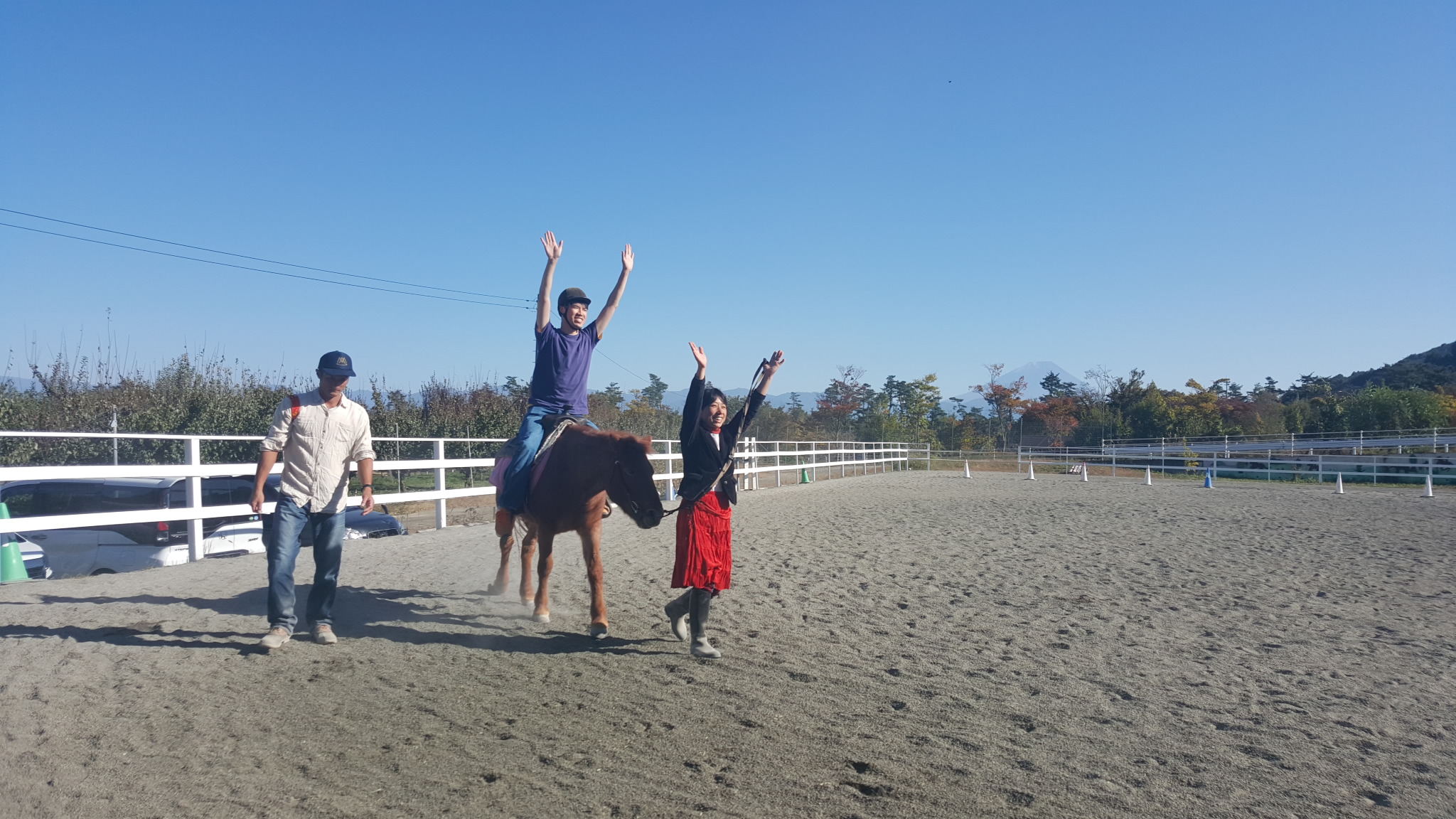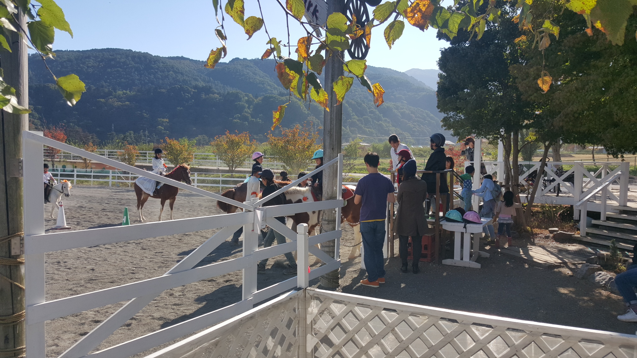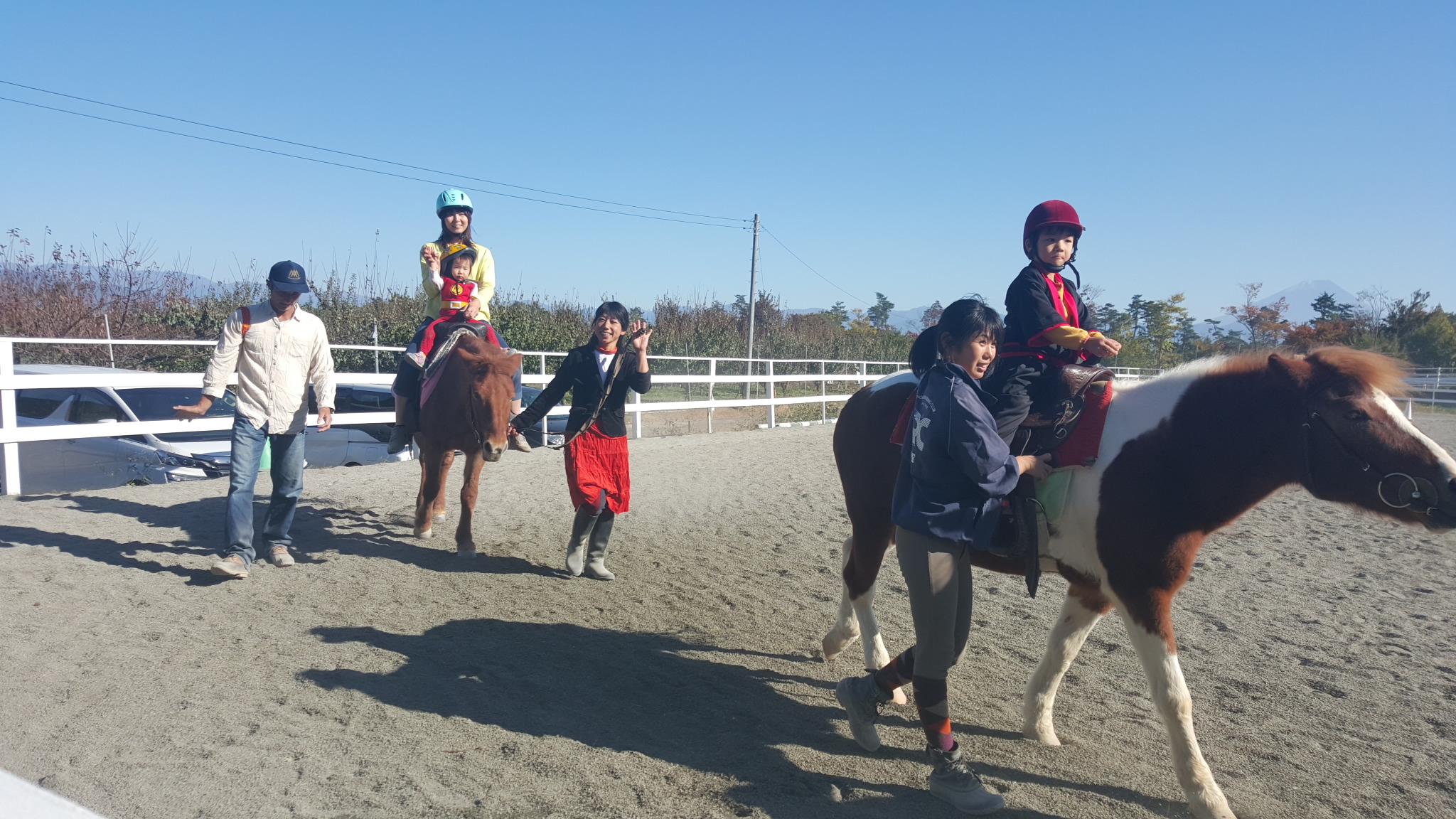 ハロウィン★ひき馬 日々の出来事 2015年10月28日 南アルプス市乗馬センターのハロウィンパーティーが始まりました(^O^) かわいいドレスを着た女の子たちやおもしろい仮装をした男の子たちも集まってきました。 順番にひき馬体験です。 たてがみを編み込んだり、おしゃれをしたお馬さんたちに乗って、写真を撮ってもらいます。 お父さんも馬の上でバンザーイ\(^_^)/ うさぎさんたちを気に入ってくれたお友だち(*^^*)