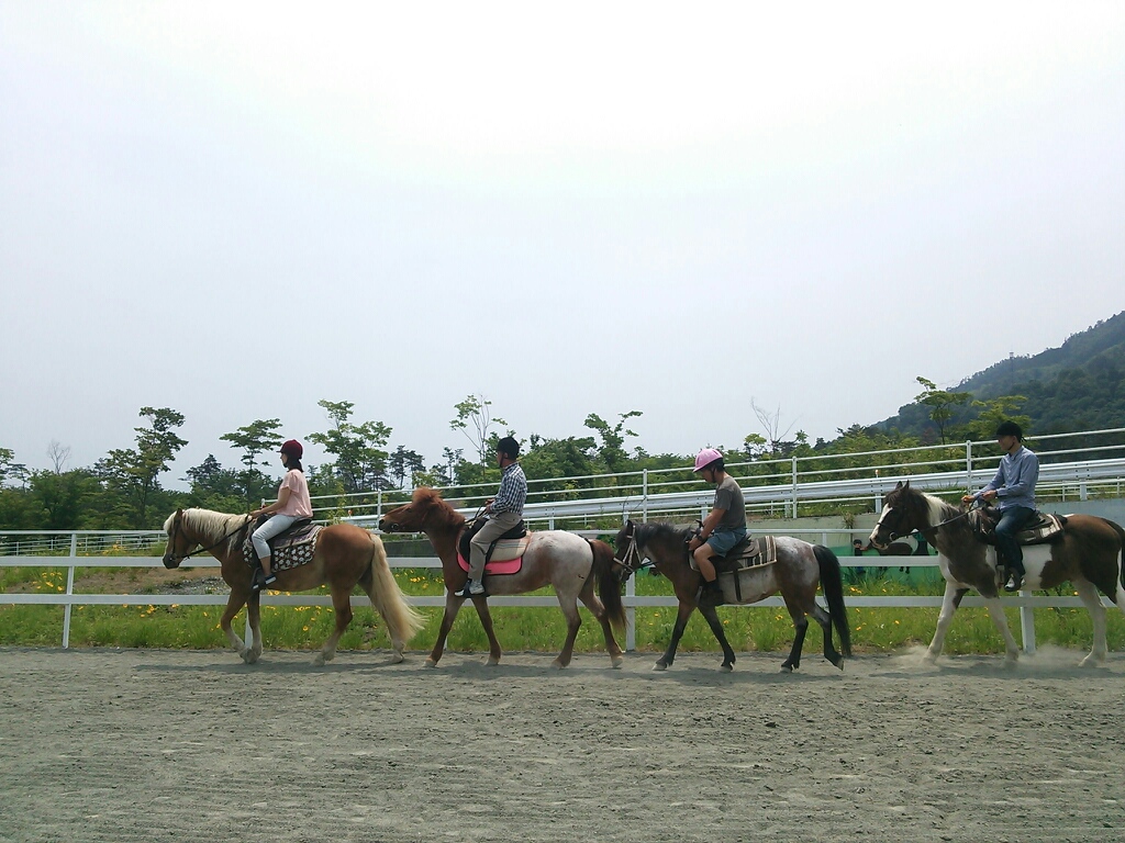 スタッフが乗る馬を先頭に 丸馬場にて、馬とのコミュニケーションを学んでゆきます。