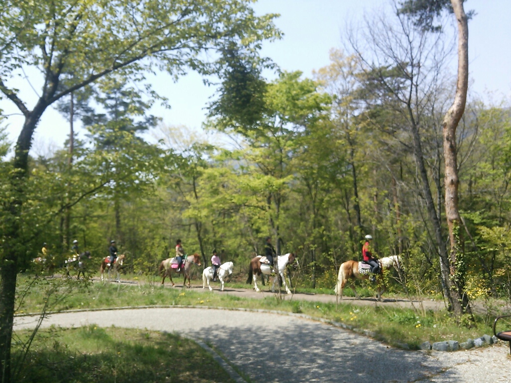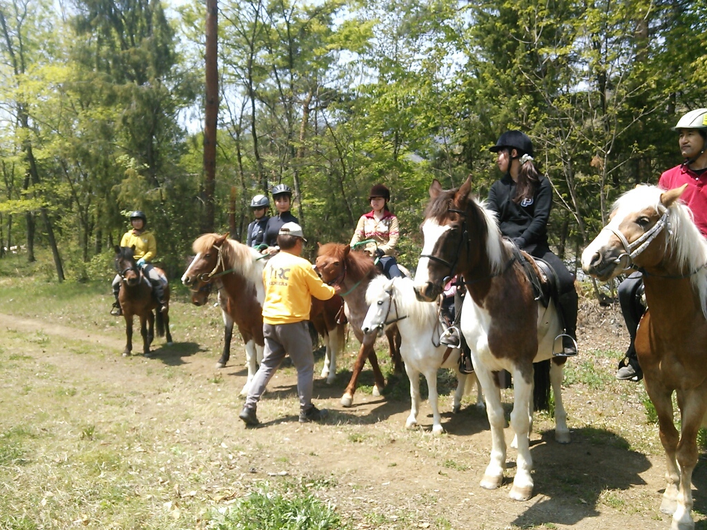 スタッフが乗る馬を先頭に 丸馬場にて、馬とのコミュニケーションを学んでゆきます。