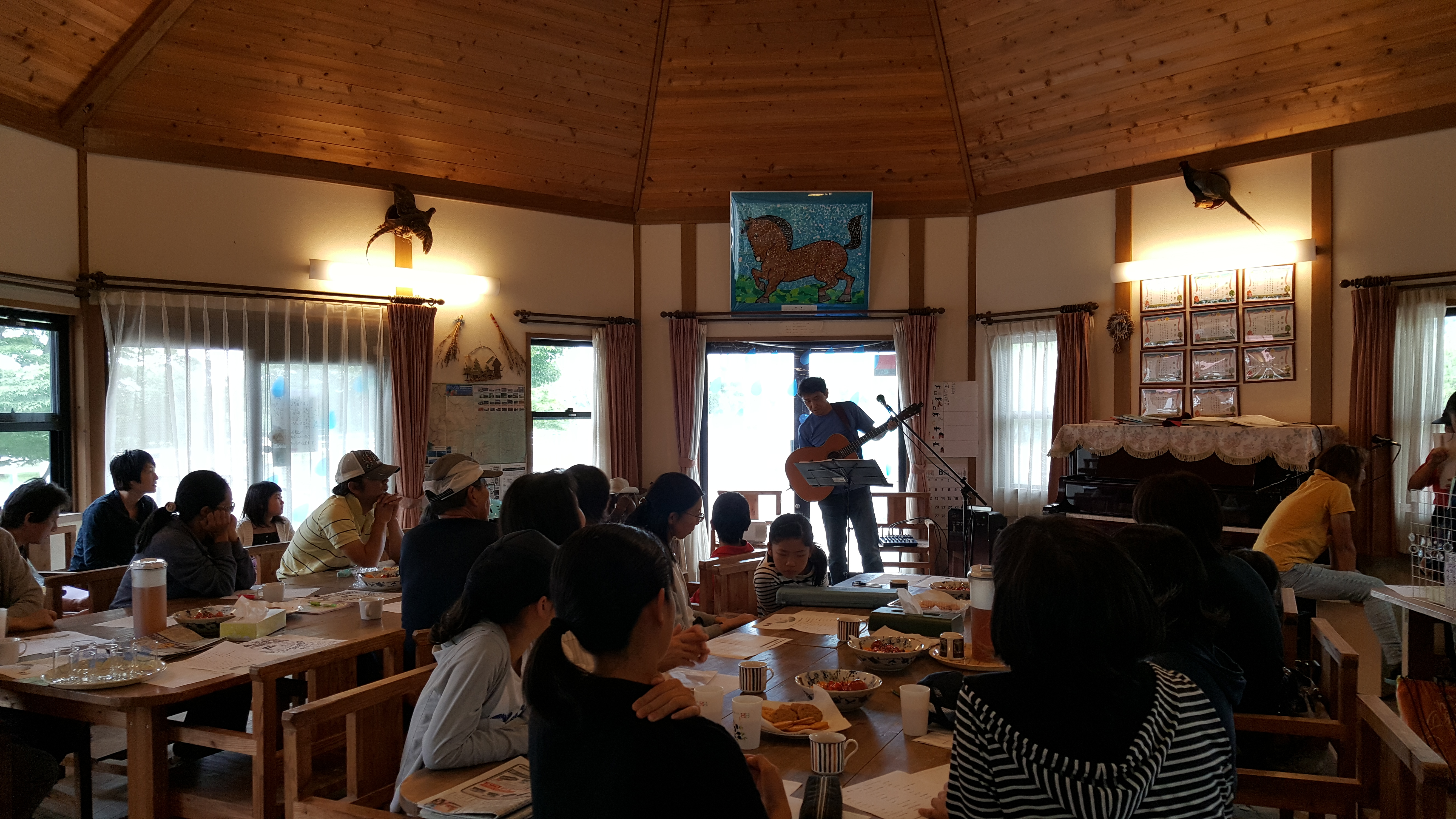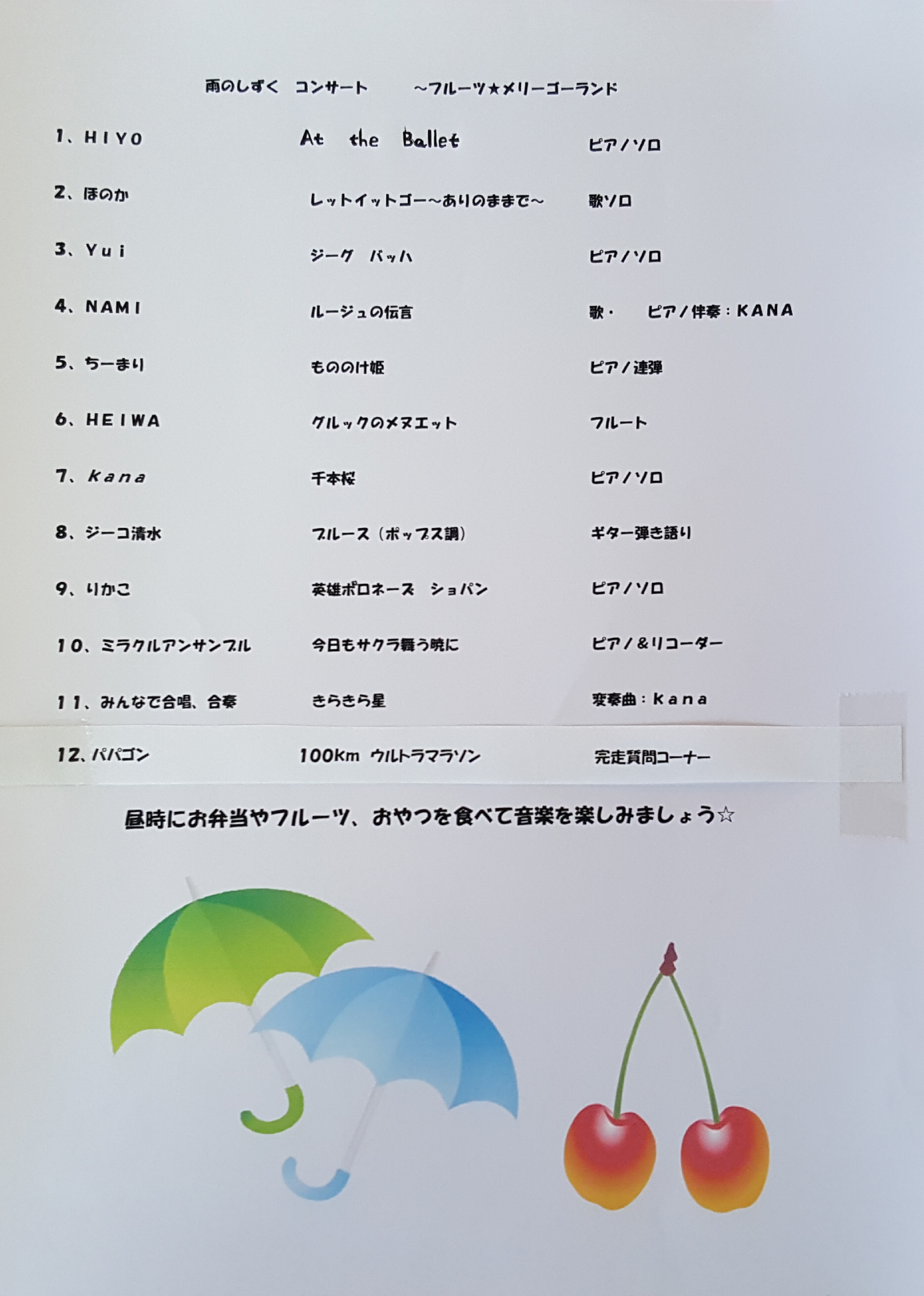 雨のしずく コンサート 前半 日々の出来事 2017年07月01日 南アルプス市乗馬センターでは、『雨のしずく』コンサートが開催されました。 盛りだくさんの演目です(^ー^) 司会・進行は、ポニーくらぶのメンバー(^○^) 『もののけ姫』しっとりと息の合った姉妹の連弾です。 フルートで、グルックの『メヌエット』が、ハウスに響きます。 『千本桜』 速くてカッコいい曲ですね!(*^^*) ギターの弾き語り ブルースで大人のお客さん方を魅了します♪ ジーコ清水さんが、メドレー曲まで披露してくださり、会場は、手拍子で盛り上がりました!!