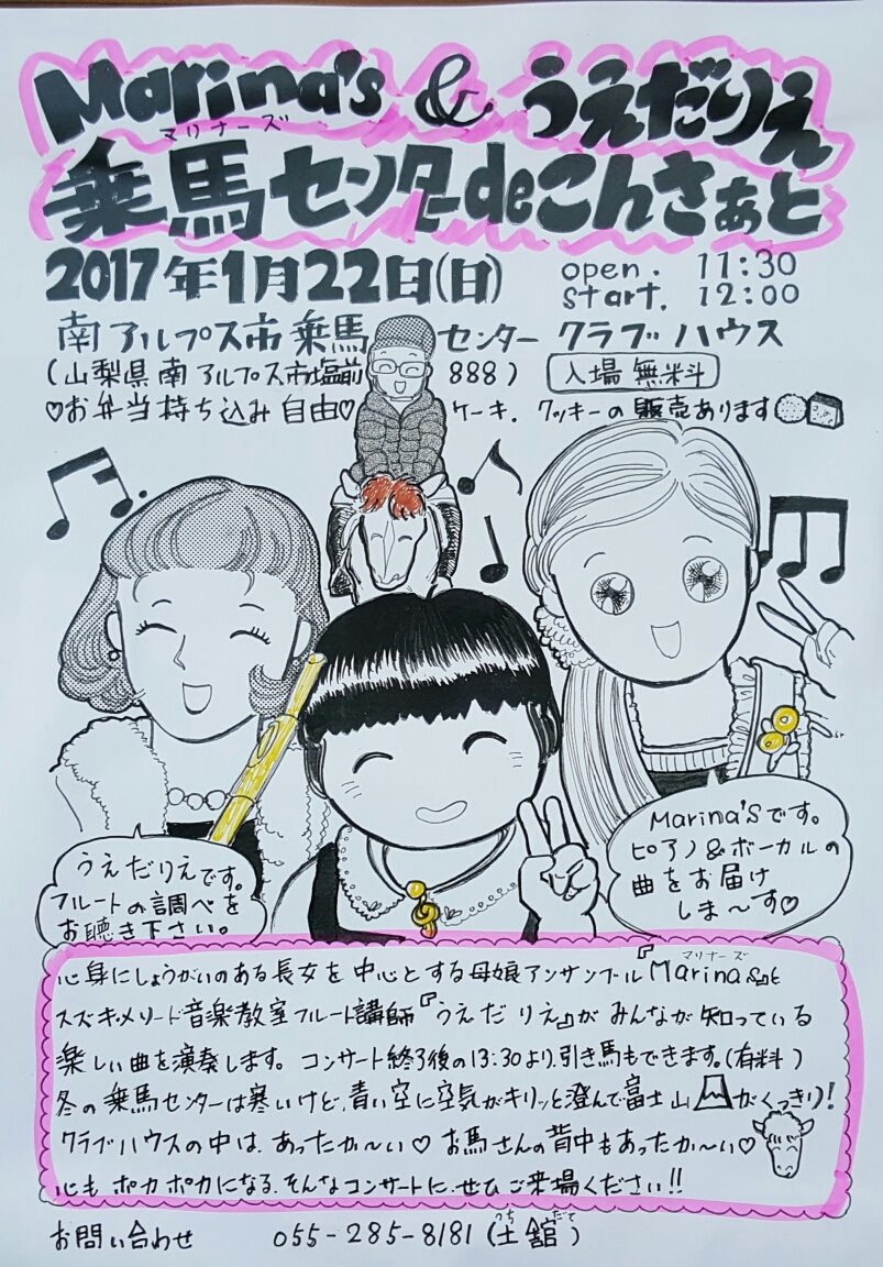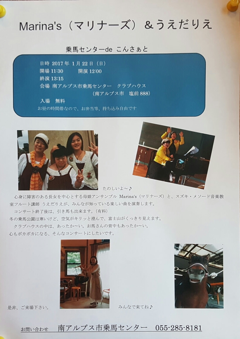 マリナーズ&うえだりえさんのコンサート お知らせ 2017年01月15日 南アルプス市乗馬センターのクラブハウスにて、コンサートが開催されます♪ 日時 2017年1月22日(日)開場 11時30分 開演12時00分マリナーズさん作成のかわいいチラシ‼ 心身に障害のある長女を中心とする母娘アンサンブル Marina's (マリナーズ)さんと、スズキ・メソード音楽教室講師 うえだりえさんが、みんなの知っている楽しい曲を演奏してくれます。○コンサート終了後の13時30分から、ひき馬(有料)もできます。 皆様のお越しをお待ちしておりま~す(^O^)