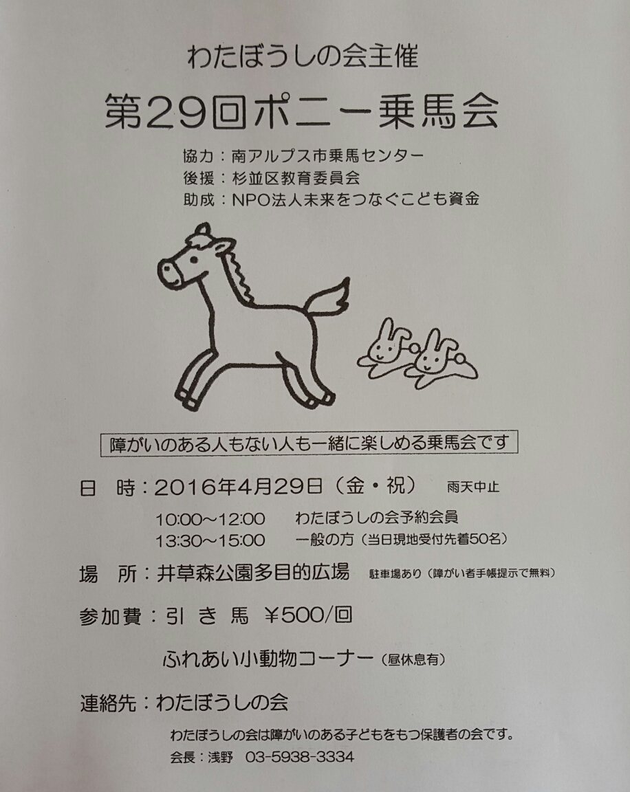 杉並区 井草森公園にて、ポニー乗馬会 わたぼうしの会主催