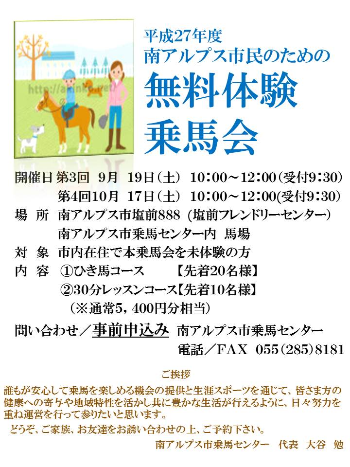 シルバーウィークの開館日 お知らせ 2015年09月02日 【休日変更のお知らせ】9月23日(水)の祝日は、開館致します。翌日の24日(木)は、振り替え休日とさせて頂きます。※南アルプス市乗馬センターの定休日は、毎週水曜日ですが、水曜日が祝日にあたる場合は開館し、翌日を休館日とさせて頂きます。★9月20日(日)~23(水)のシルバーウィーク南アルプス市乗馬センターで、初乗馬体験は、いかがですか?遠方からのお客様も多く、普段、セラピーホースとして活躍しているおとなしい馬たちが、受け入れてくれますよ。乗馬レッスンや外乗のご希望のお客様は、ご予約くださいね。お問い合わせ先南アルプス市乗馬センター(南アルプス市塩前フレンドリーセンター)電話:055-285-8181住所:〒400-0231 山梨県 南アルプス市塩前 888メール:minami-alps.jyoba@sky.plala.or.jp