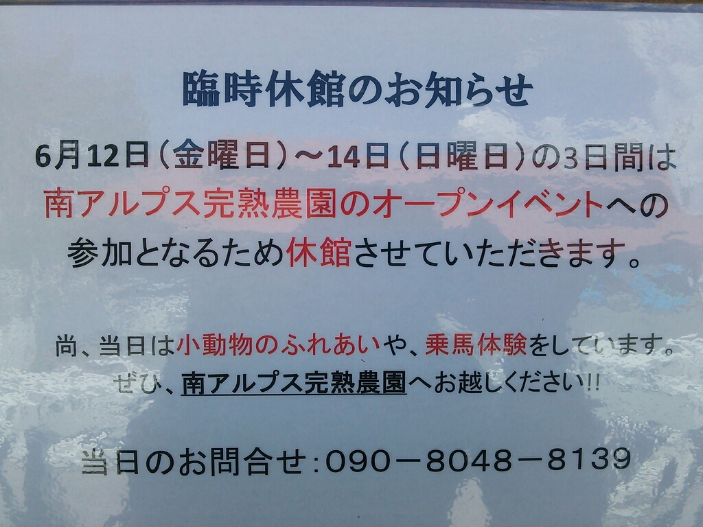 完熟農園オープニングイベント お知らせ 2015年06月01日 南アルプス市乗馬センターは、『南アルプス完熟農園』のオープニングイベントにて、出張乗馬と動物ふれあい広場を行います。各種イベントやレストラン、マルシェなどもありますので、ぜひ、ご来場ください。詳しくは、『南アルプス完熟農園』のホームページをご覧になってください。南アルプス市乗馬センターは、この期間、臨時休館致します。ご了承ください。